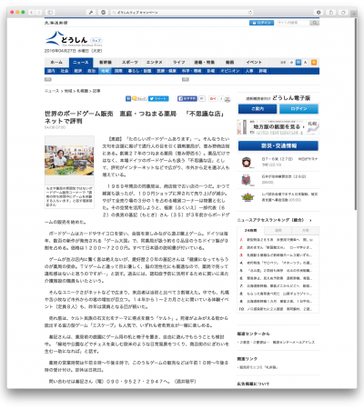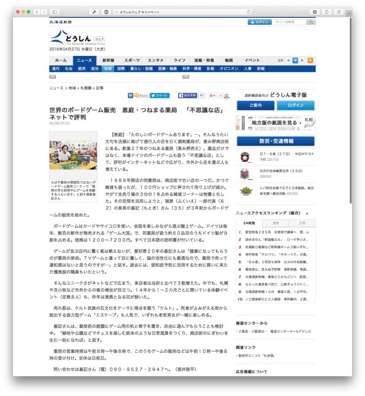 先週北海道新聞社様から取材を受けました!北海道新聞恵庭千歳版の欄に、こみゅゲームズつねまるくんの取材記事が載りました。なぜこの御店をはじめたのか?売れ筋のゲームや・オススメのゲームなどについて語りました。どうしんWeb版をご覧いただける方はそちらも是非御覧ください。